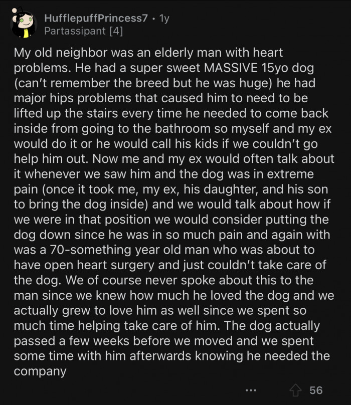 "We would talk about how if we were in that position, we would consider putting the dog down since he was in so much pain."