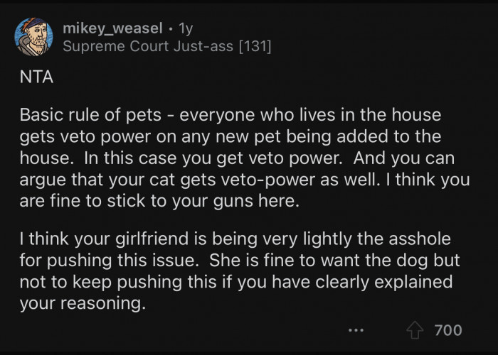 A Redditor who goes by the username u/Sparkys_Human made a post on the r/AmItheA**hole subreddit, where he explained how he refused to let his girlfriend get a dog because his cat hates them. The user felt unsure about his decision, so he decided to consult the Reddit community and received many interesting reactions to his post.