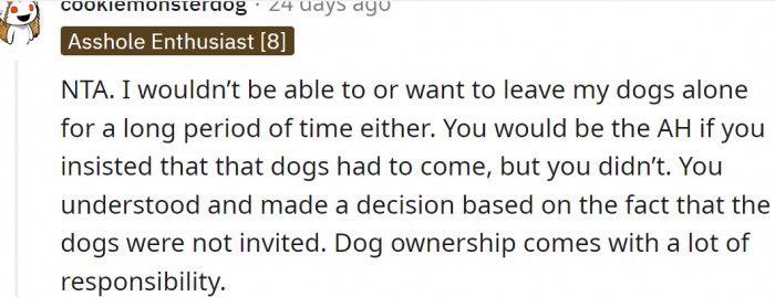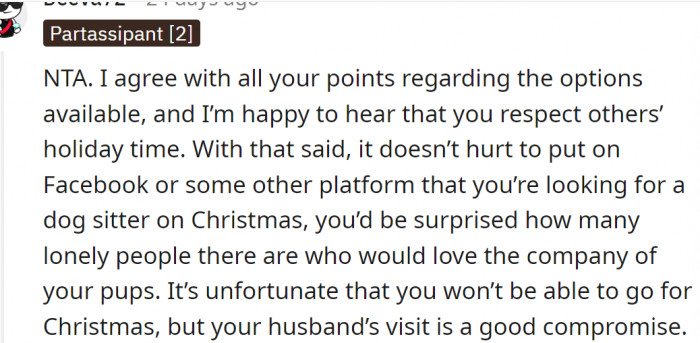 OP completely understands that not everyone wants them in their home. OP and her husband received an invitation from her mother-in-law (MIL) for the Christmas holidays. The whole family will be there, so there is no room for the dogs.