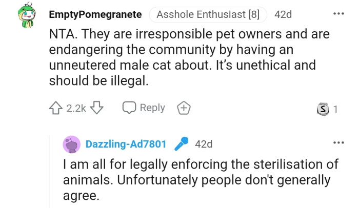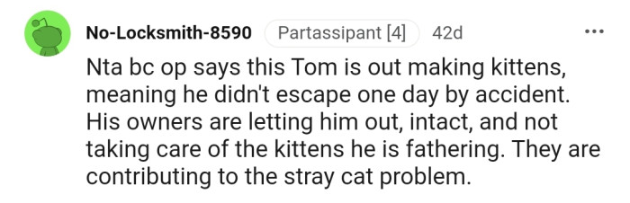 "They are irresponsible pet owners and are endangering the community by having an unneutered male cat about."