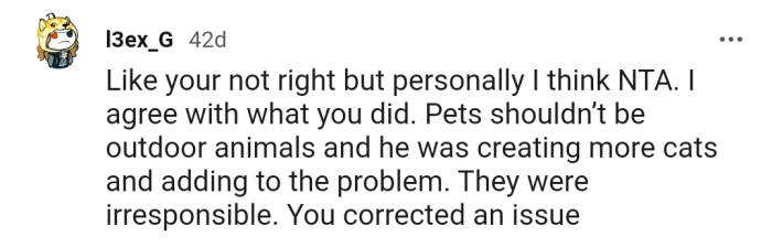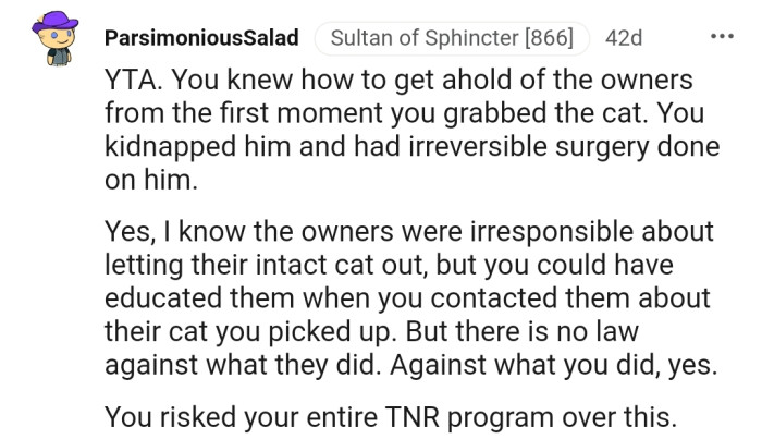 Though acknowledging the potential misstep, OP stands firm in their belief that their actions were driven by a genuine concern for the welfare of stray cats.