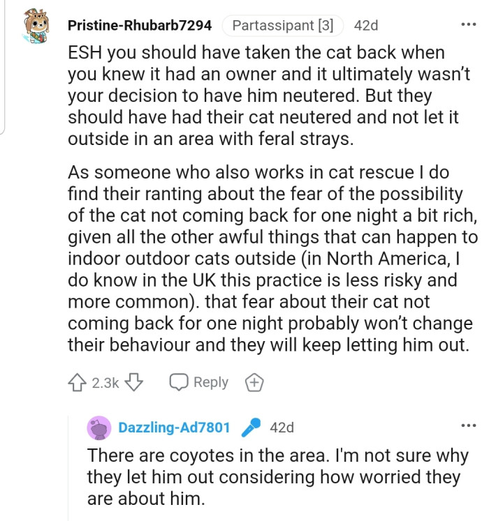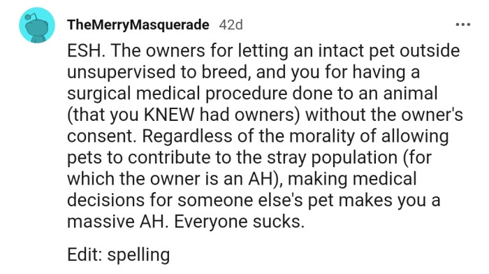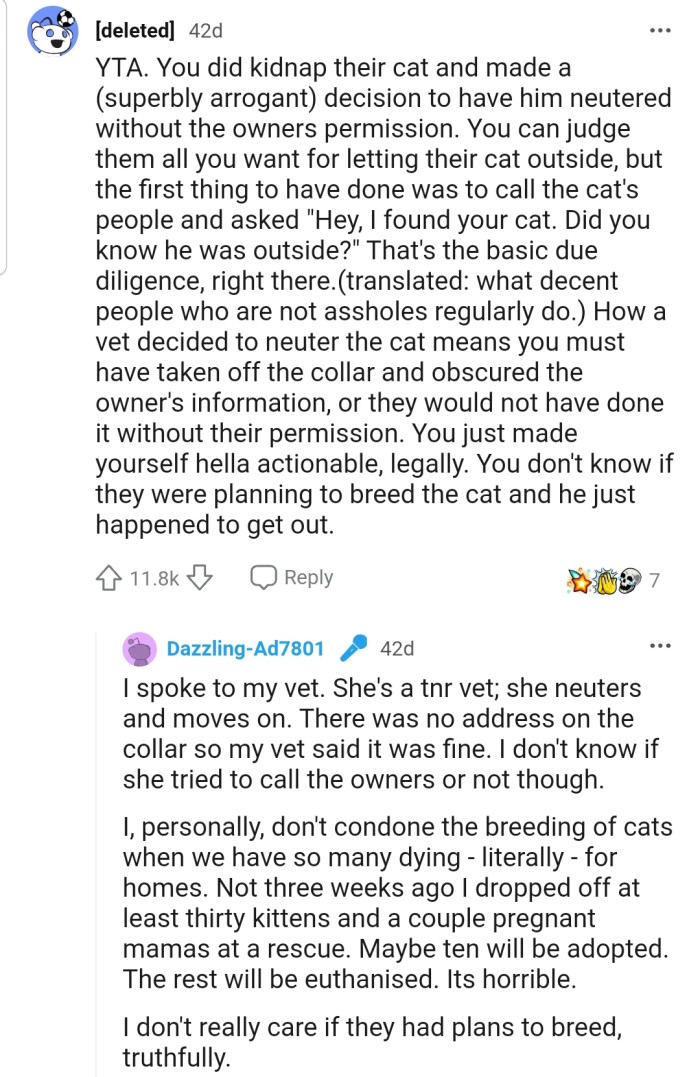 In an effort to prioritize the welfare of not only this specific cat but also the larger stray cat population, OP made a difficult decision. They took the cat under their care and arranged for its neutering procedure.