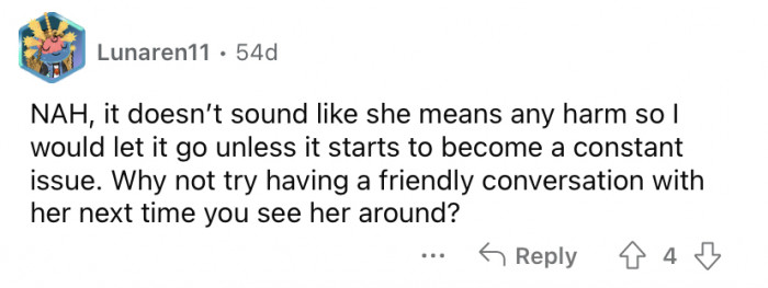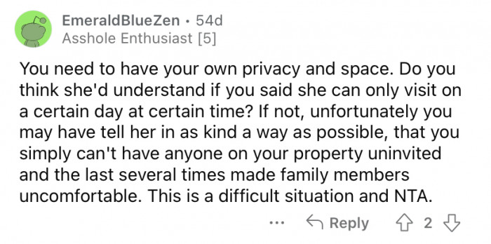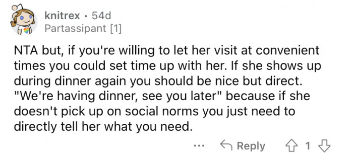 OP says she feels uncomfortable about the lady showing up at her home that way, so she asked the Reddit community for advice on how to address it. Keep scrolling to find out how people reacted.