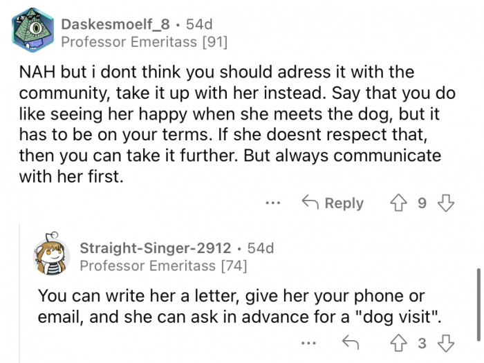 Either way, kindness is always the best policy. Perhaps she could allow the lady to see her dog at designated times, as some members of the Reddit community suggested.