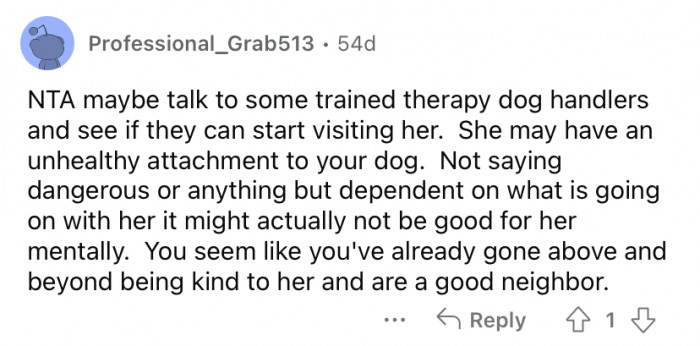 The Reddit user began to notice the woman walking by her house sometimes, so she would say hello, and if time permitted, she would bring the dog out to say hello to the lady.