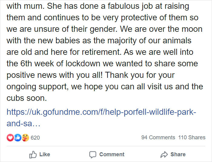 The sanctuary is currently closed due to the coronavirus lockdown and now exclusively shares news of its new guests through social media. The Porfell Wildlife Park and Sanctuary is struggling financially due to the pandemic.