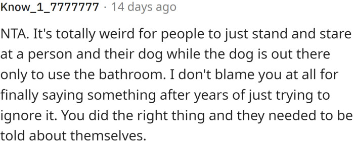 OP has been living there for three years and has seen people come and go, but one family has a habit of waiting right outside the gate, staring at OP and their dog until they feel uncomfortable enough to leave.