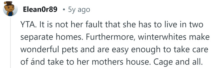 She's angry because we're being unfair. I explained that we aren't, she needs to be here to look after her pet. She claims we're treating them differently, and my husband thinks we should just buy her one and do the care while she's not here. It's also well known hamsters don't make good pets. You can't do much with them. Not to mention she doesn't have a job and is currently spending all her allowance on herself so she probably wouldn't pay for the hamster.
