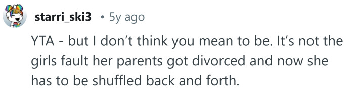 Things became complicated after the OP remarried. Her husband has a teenage daughter who splits time 50/50 between households.