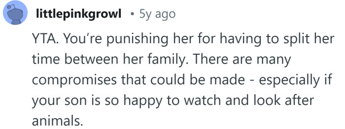 With family dogs, shared cats, and access to some of her son’s friendlier animals, the OP feels she’s offered reasonable alternatives. Still, she’s torn — and asking Reddit: Is she the bad guy for standing her ground?