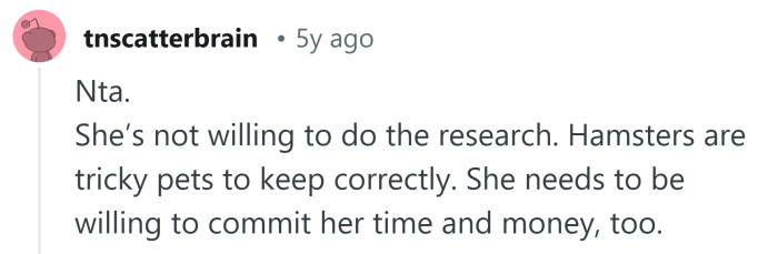 The daughter has taken an interest in the son’s pets and now wants a hamster. The problem? She’s gone every other week, doesn’t want to research proper care, and wouldn’t be responsible for expenses or daily upkeep.