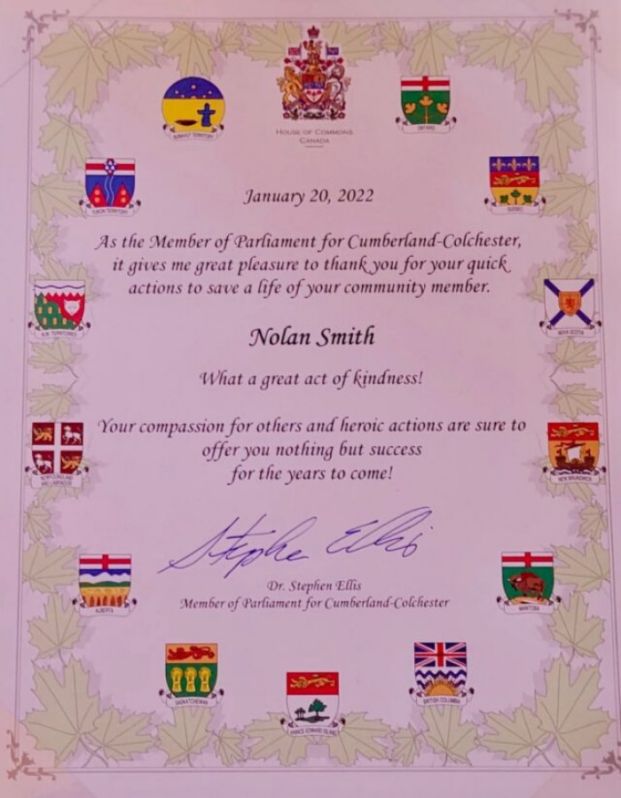 Cumberland-Colchester MP Stephen Ellis, proud to have young men of such outstanding character, awarded the Smith brothers with honors for their acts that saved a community member's life.