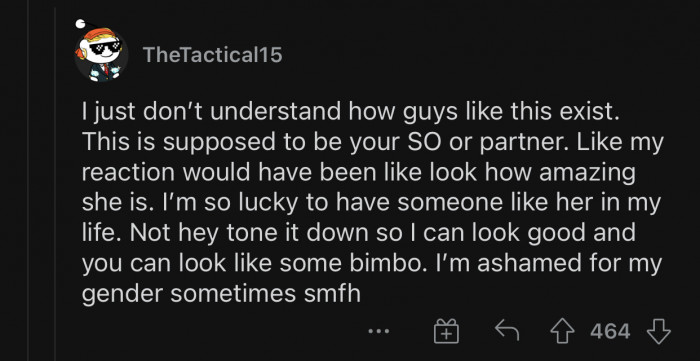 "Hey, tone it down so I can look good and you can look like some bimbo."