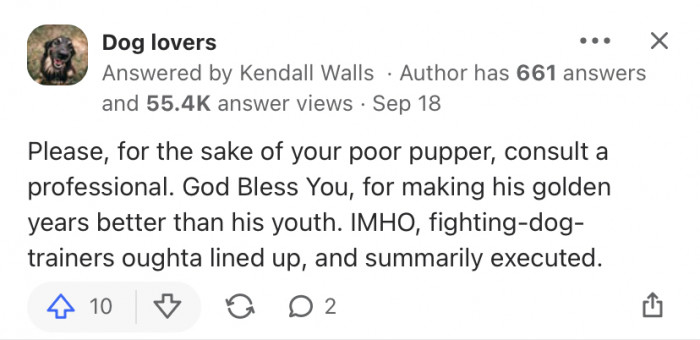 A Quora user posted a question on how to train an aggressive dog, or more specifically, an ex-bait dog.