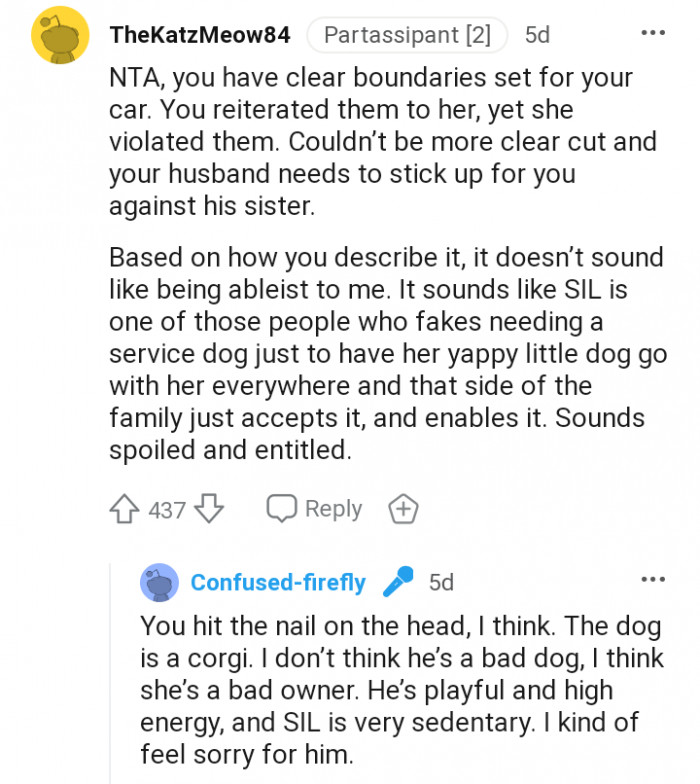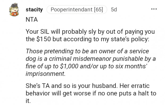 "It sounds like SIL is one of those people who fakes needing a service dog just to have her yappy little dog go with her everywhere"