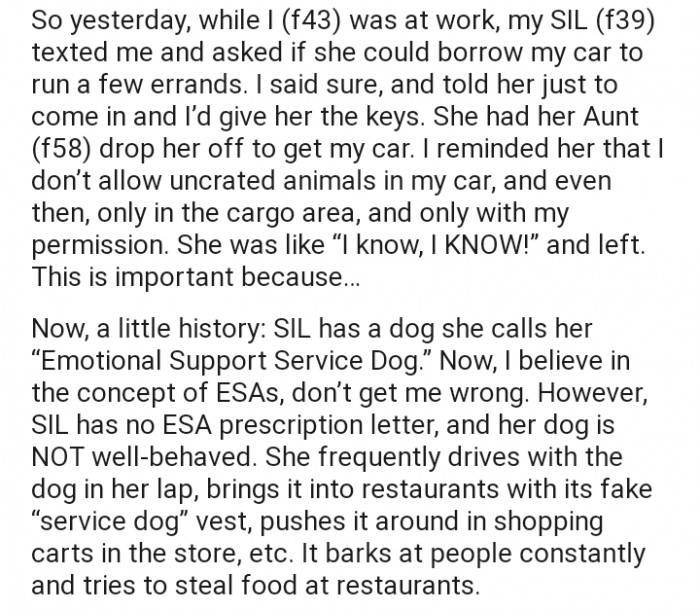 OP (original poster) explained that she allowed her SIL to borrow her car to run a few errands. But on the condition that she avoids bringing in any uncrated animal inside.