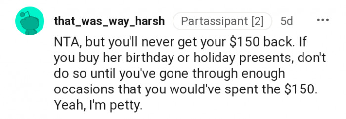 "If you buy her birthday or holiday presents, don't do so until you've gone through enough occasions that you would've spent the $150"