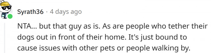 This grassy area is a popular spot for walking dogs, as it is nobody's yard and is located three car widths away from the nearest home. One day, while OP was walking their dog in the grassy area, they noticed that another resident had tethered their dog outside