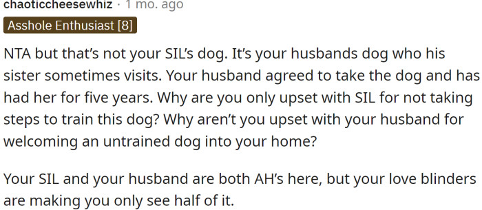 For OP, initiating a family meeting to discuss the care of the dog could serve as a constructive step forward. Encouraging all family members, including her sister-in-law, to share their thoughts and feelings about the situation can help in reaching a consensus that honors everyone's needs and promotes a more harmonious living situation.