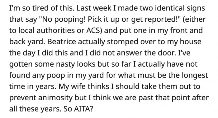 Beatrice was fuming when she saw OP's signs and tried to talk to him, but OP was unable to answer his door. As for his other neighbors, they have been giving OP the stink eye, but for the first time in years, there is no poop to be found anywhere on his property.