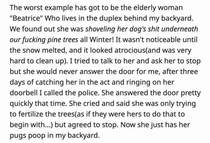 Beatrice lives in a duplex behind OP's backyard. They found that Beatrice was actually shoveling her dogs' poop underneath OP's pine trees that entire winter.