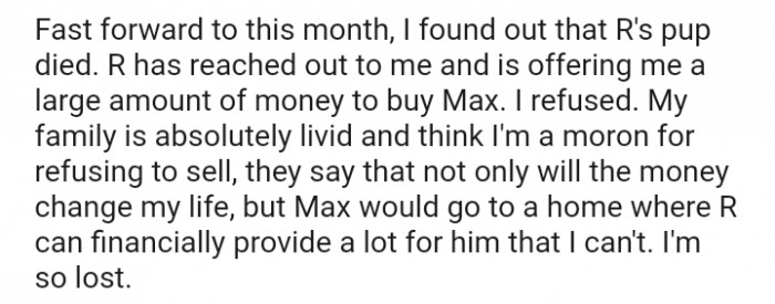 Woman's Own Family Pressures Her For Refusing To Sell Her Beloved Dog To Her Rich Ex For A Huge Sum Of Money