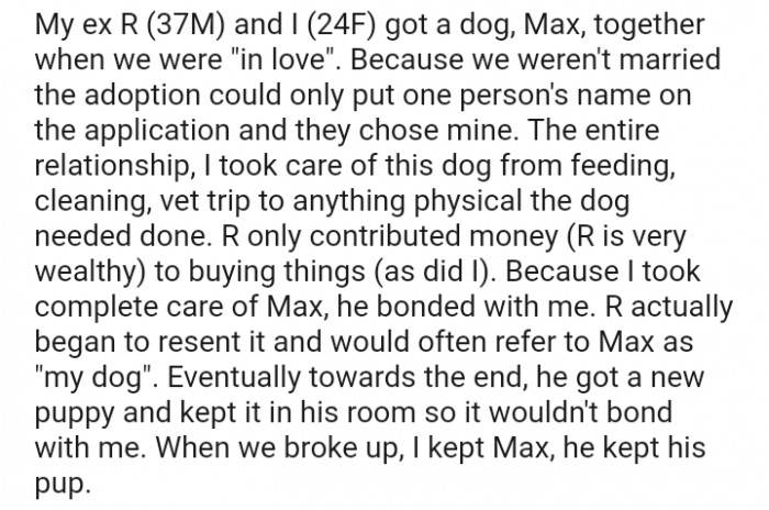 Dogs are widely regarded as a person's best friend. Though their lovely looks and upbeat demeanors bring us so much delight, did you know that owning a dog has a number of advantages as well? According to Dr. Terry Wahls, a physician and health expert, "The companionship of a dog can significantly enhance emotional well-being and reduce stress." Your puppy can truly help enhance your health and social life, from helping you become healthier to meeting new people. The unconditional love we receive from dogs makes it only reasonable that we treat them with the utmost care. Dogs offer one of the easiest and most rewarding interactions one could hope for. Generally speaking, making them happy just requires giving them a place to live, nourishing food, clean water, acceptable toys, enough suitable activity to help them burn off physical and mental energy, and companionship. Quite a short and simple list for a best friend, don’t you think? With all these benefits, why would anyone want to sell their dog? Though we know there are people who would give up their dog for the right amount, this Redditor wasn’t one of them. She shared her story on the famous r/AITA subreddit community, talking about how her ex wanted to buy her dog, Max, after his pup died. As you can already tell, the 24-year-old OP refuses to take the huge sum offered to her, as Max was much more important to her than any amount in the world.